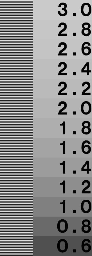 Once you have adjusted the brightness and contrast controls on your monitor to your liking, the following chart (Figure 2) may be used to determine what your combined system response is. To use the chart, simply match the average brightness of the horizontal black and white lines on the left side to a patch on the right side. Standing back or blurring your vision may help to make the comparison easier. The number in the matching patch tells you what your system gamma is.