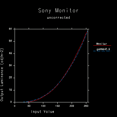 Figure 1 shows the measured response of an uncorrected 20 inch Sony Trinitron monitor and a close fit using a power law curve with a gamma of 2.6. Typical response gammas vary between 1.8 and 2.8, with the mean somewhere near 2.4. The exact response also depends on the brightness and contrast settings.