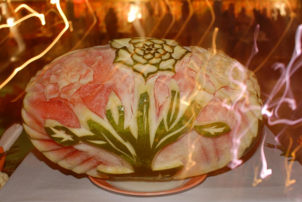 One of several intricately carved watermelons, with