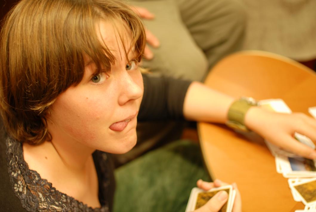 Alina playing solitaire during cocktail hour.