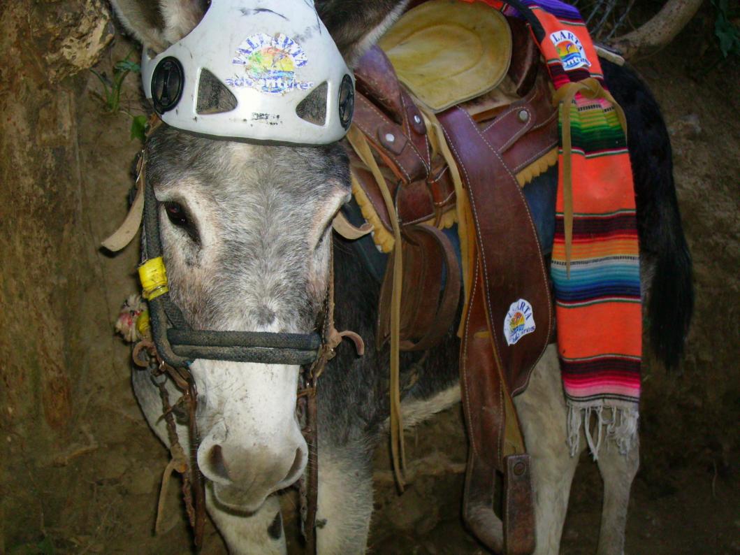 a hard-hat, but this poor donkey was still tied up to