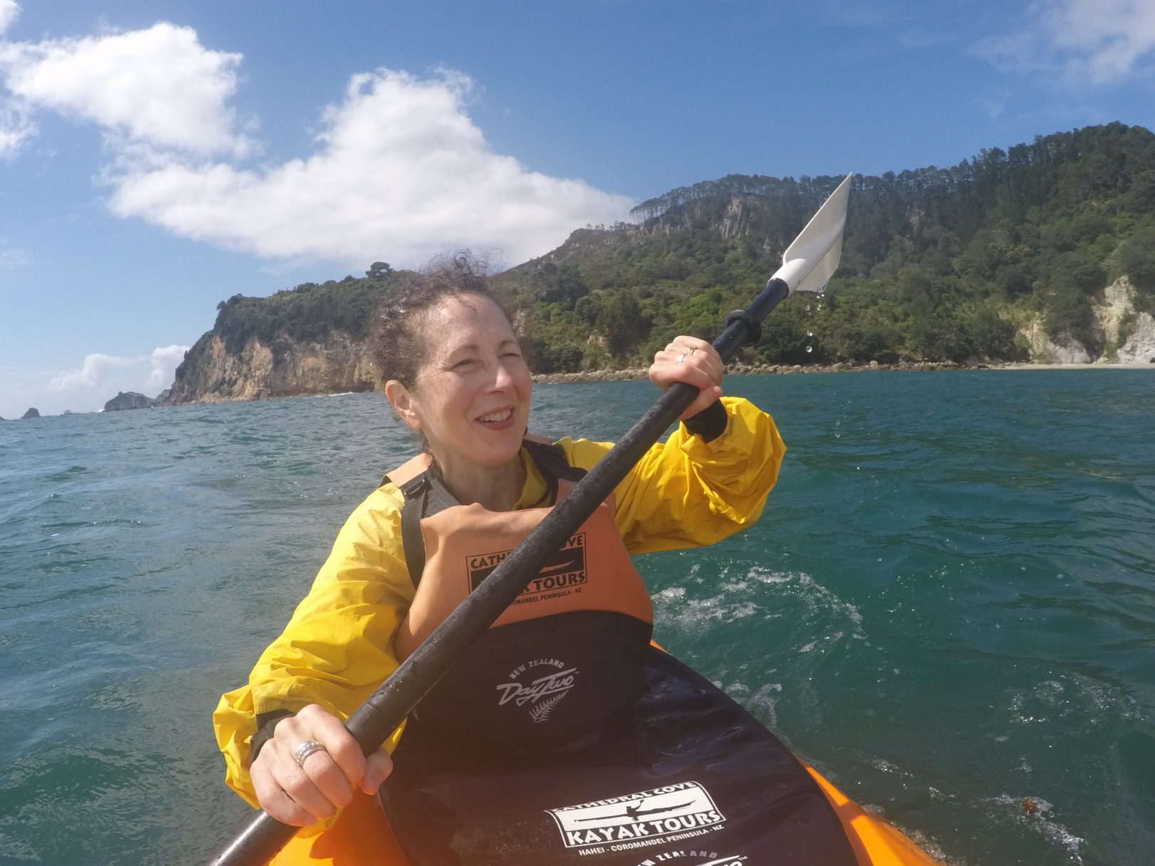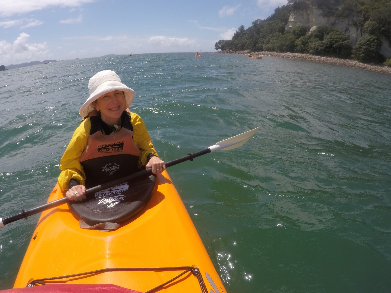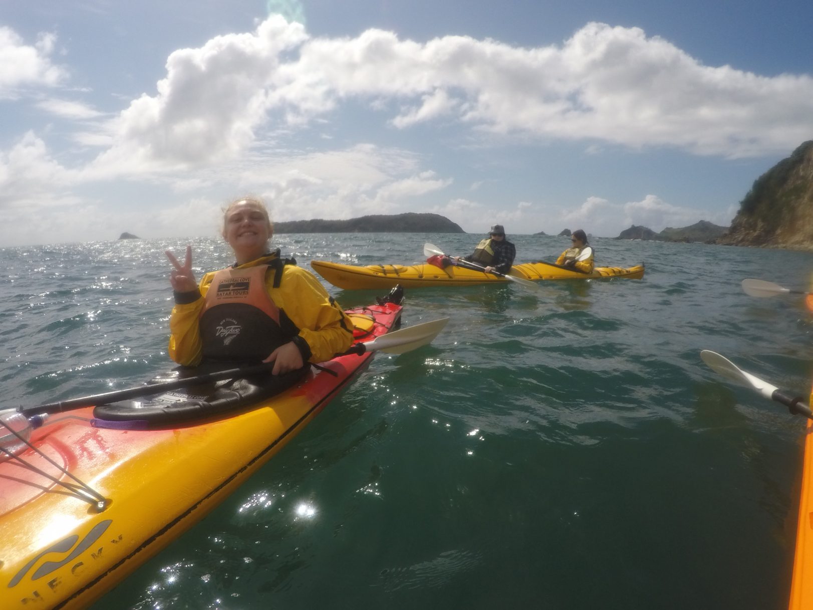 Page 21, wherein about half of us go on a final group kayaking adventure on Lake Mapourika.