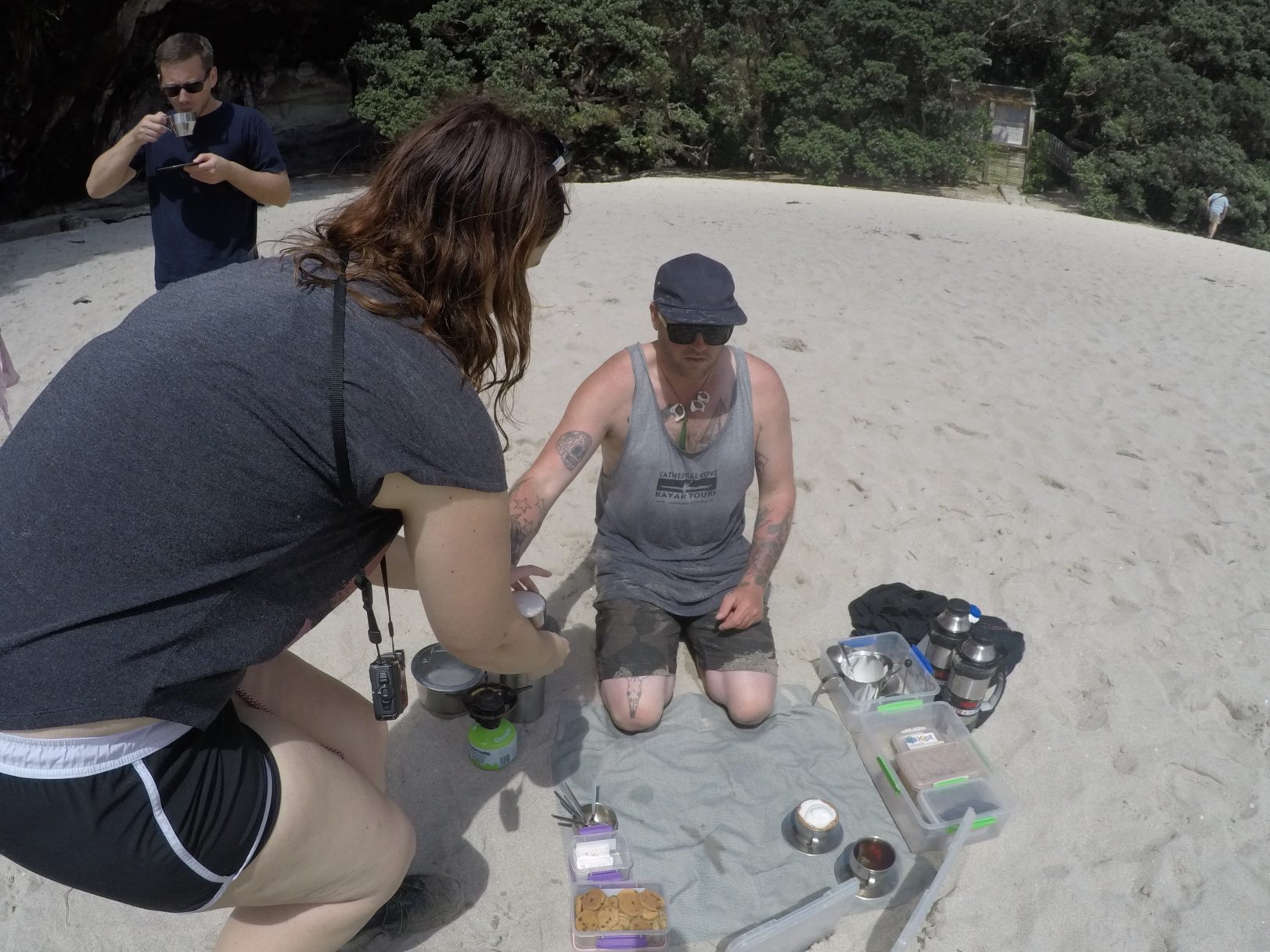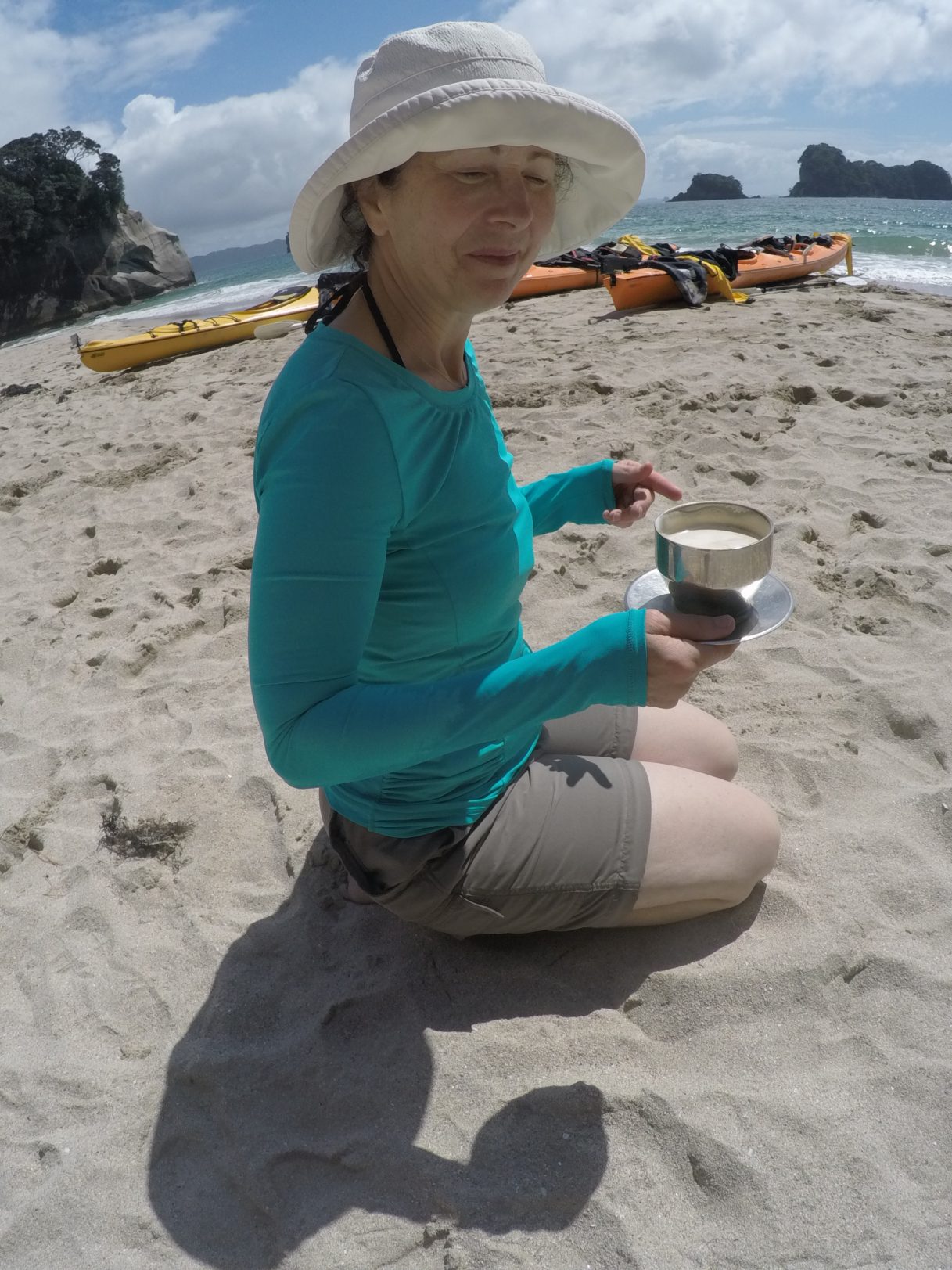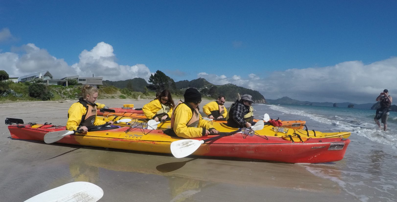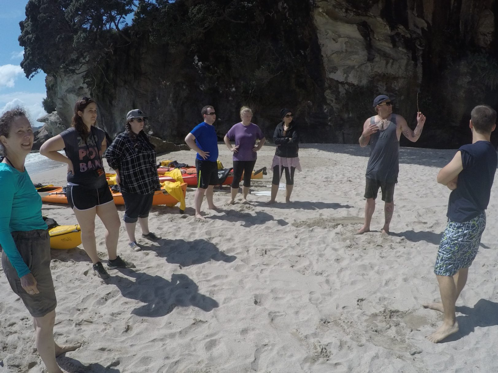 Page 21, wherein about half of us go on a final group kayaking adventure on Lake Mapourika.