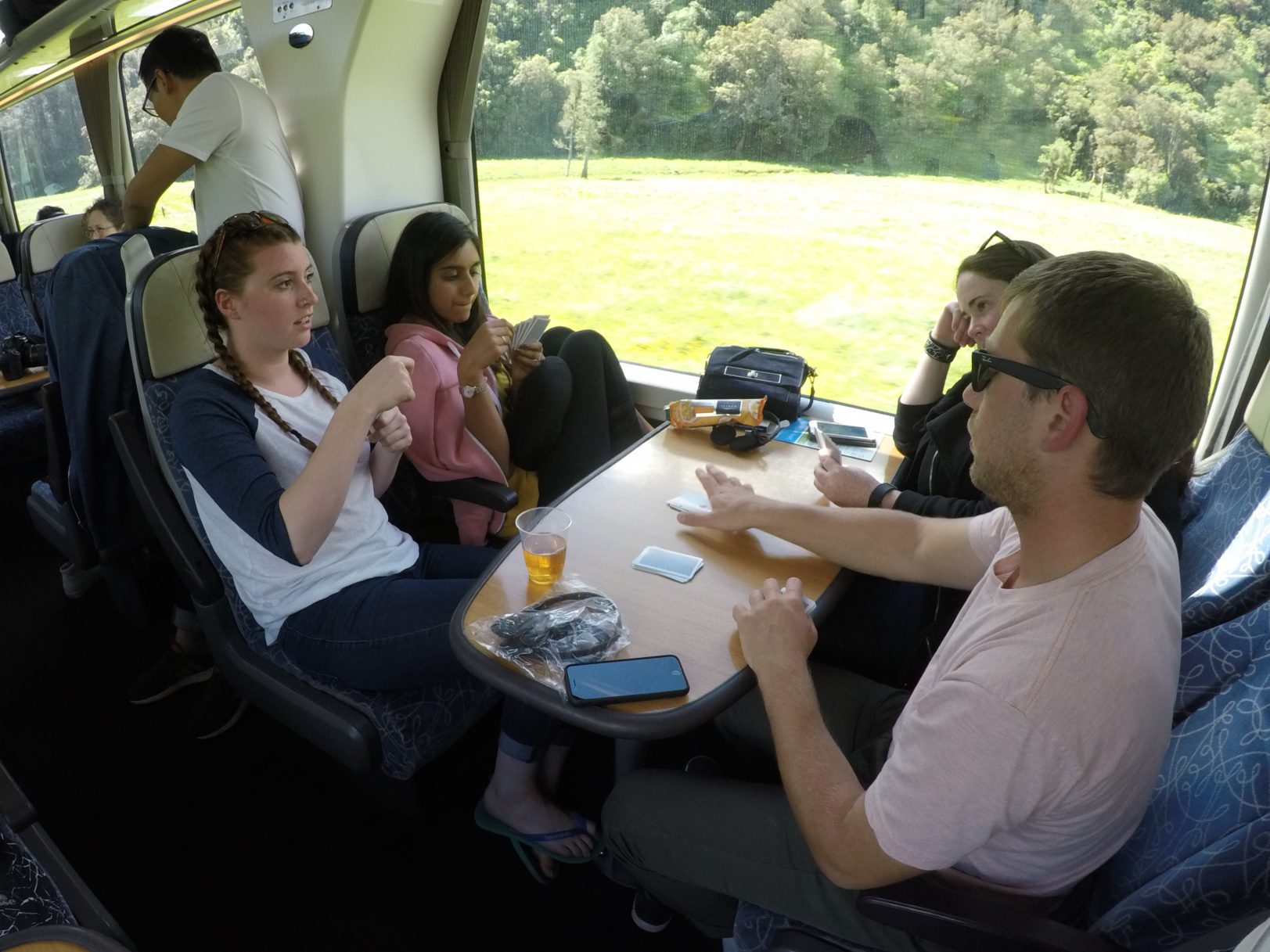 Page 22, wherein some brave singers stand up for karaoke night at the pub. The next day, we stop in Hokitika and see some live kiwi birds on our way to catch the train in Greymouth.