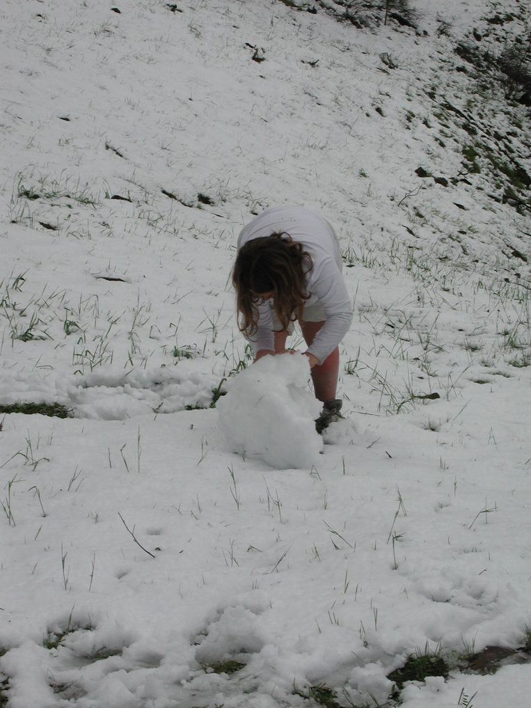 Alina tries to build a snowman in two inches of snow...