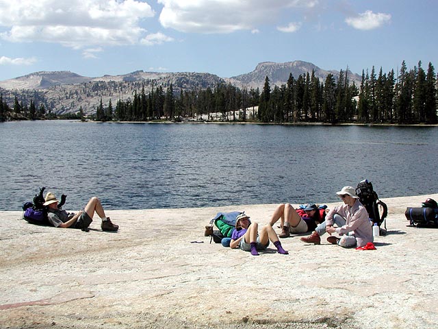 We were so overjoyed when we finally made it to the lake, we took off our packs and rested a while by the waterside. That's Cathedral Peak in the background. I must have taken about 100 pictures of it, since it looked different from every angle.