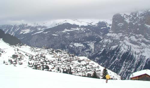 After finishing the business end of things, Avi headed home and I headed to Muerren, a small, car-free resort villiage in the Jungfrau region of the Swiss Alps. There, I arrived just in time for a parade to celebrate the annual "Inferno" ski races, which include downhill and slolem.