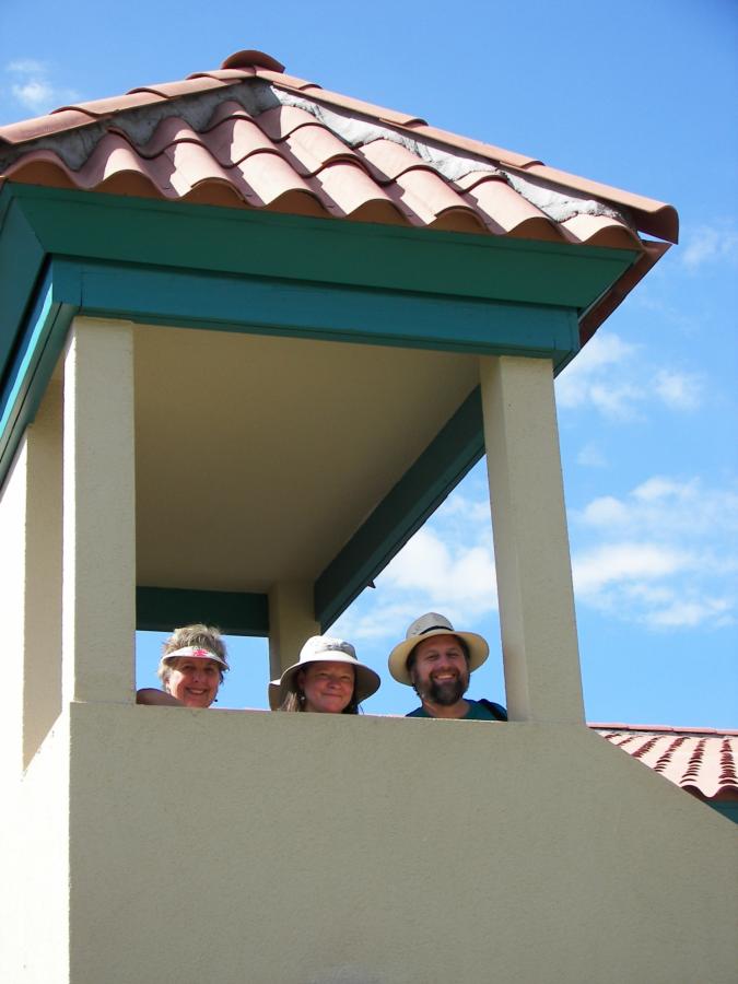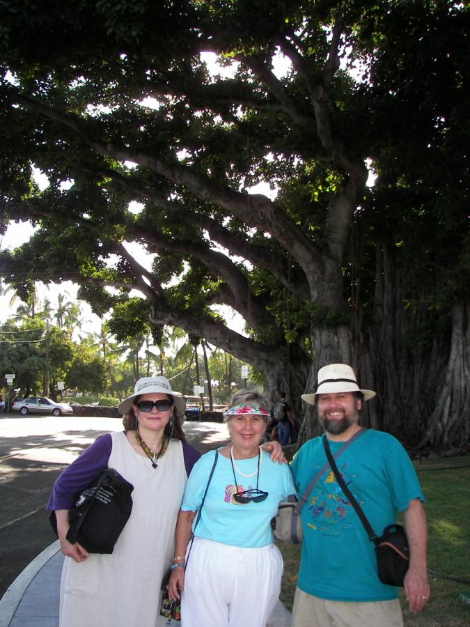 Sandy, Mom, & Tedd in front of a very old and well-developed