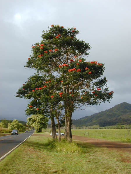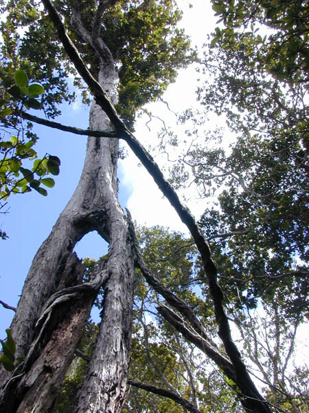 Many of the trees had large, brilliant blossoms near their tops for pollenation by native birds. Since birds get to islands long before insects make the oversea migration (usually by boat), many plants adapt themselves for bird-pollenation.