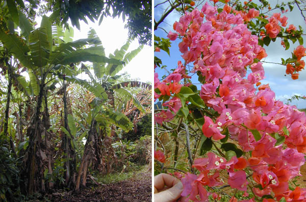 Here is some of the typical flora -- banana palms(?) and bougainvillea.