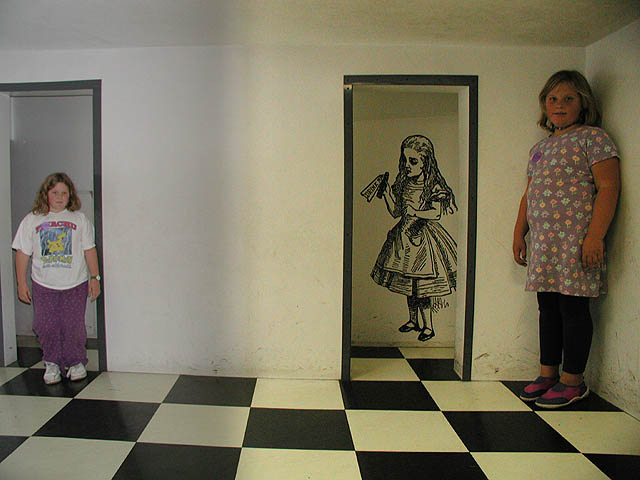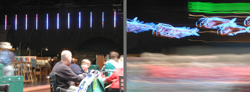 This display is a good example of the genius of this place. LED bars flicker in seemingly random patterns, until at some moment your eyes happen to sweep across the room, when suddenly, you see these flying figures! I had a difficult time capturing even a reasonable facsimile of this illusion with my camera, since I couldn't manage a steady sweep without a tripod, something your eyes do effortlessly.
