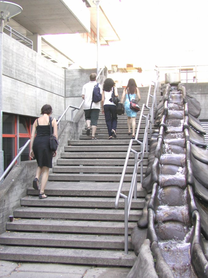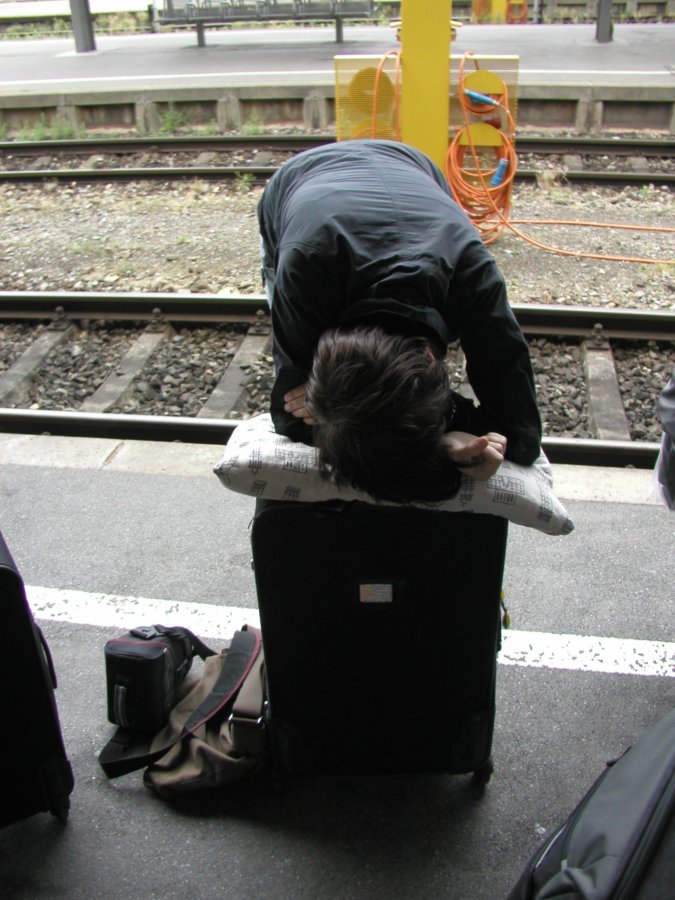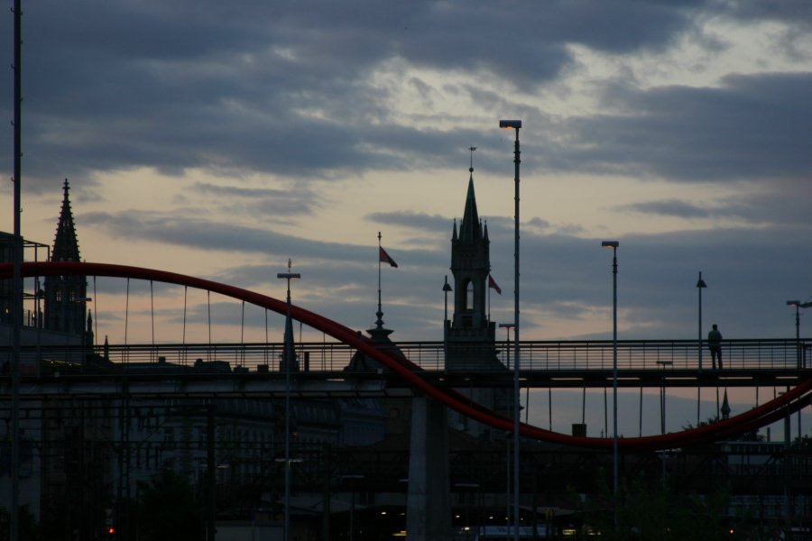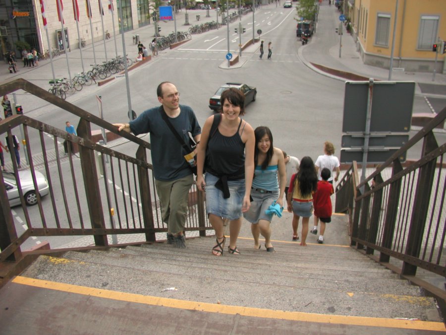 Climbing a bridge over the train station tracks, we
