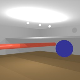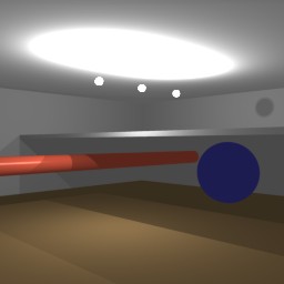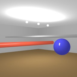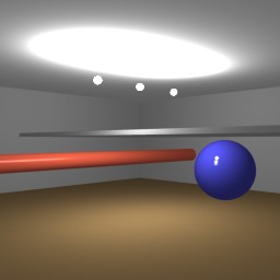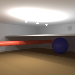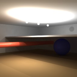 Finally, by adding global illumination effects to our model, we begin to appreciate the benefits of rendering in a linear color space. In this scene, the difference is apparent in the region under the shelf, where the subtle changes in shading on floor and the soft specular highlight on the blue ball are apparent in Figure 3a, but are drowned in the exaggerated contrast of Figure 3b. Strangeness is also noticeable in the clamping near the highlight on the cylinder, and the excessive color bleeding on the ceiling of Figure 3b.