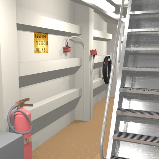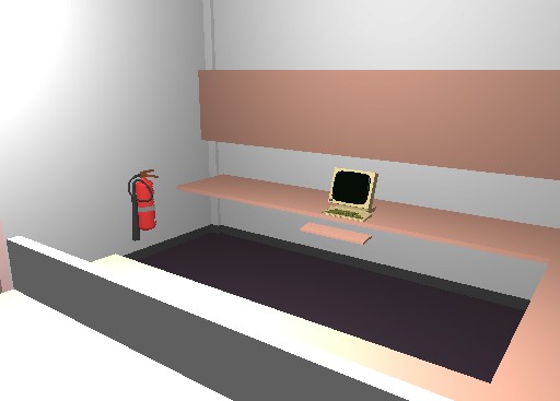 Fig. 1 shows a VRML gamma-2.2 rendering of an office scene with a nice fire extinguisher. (Click here if you want to look at the VRML for this scene.) We see this image and decide we'd like to use the fire extinguisher in our own model. We import the VRML model into our rendering and animation system, and extract the fire extinguisher object. This then gets put into a cruiser model we've been working on, shown below.